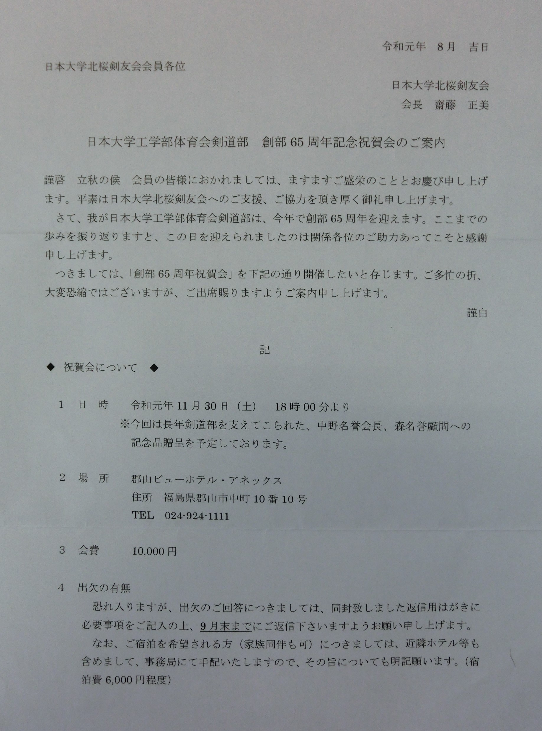 8月吉日付けにおきまして、日大工学部剣道部65周年祝賀会の
